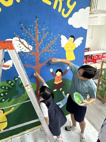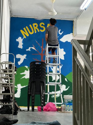 At the tail end of our renovations, long time volunteer Daniel Ngiam painted a mural in our new nursery play area. The mural adds colour to our school and helps bring our freshly redesigned space to life. We hope the mural, reading “NURSERY” at the top, gives the youngest students a sense of belonging at our school.