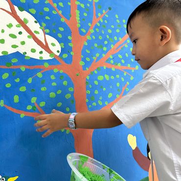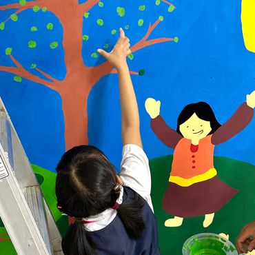 The centerpiece of the mural is a padauk tree, the national tree of Myanmar. Our students came together to create the leaves with each leaving a thumbprints. The fun activity allowed our students to make a creative and permanent mark on our school. The mural will be a living fixture in our school, where new students can add their own fingerprints as they join the ZRCLC family.